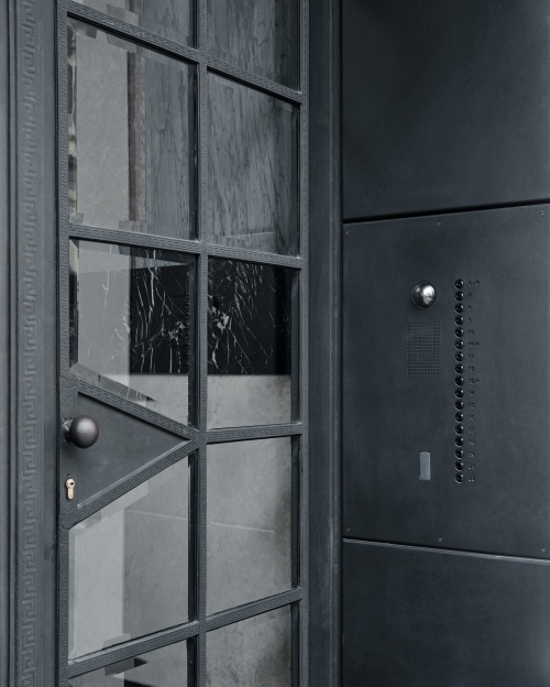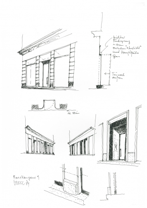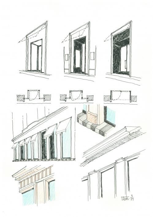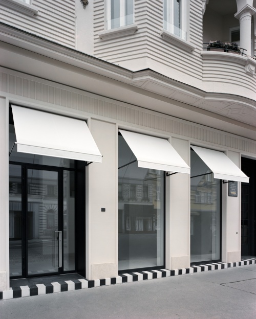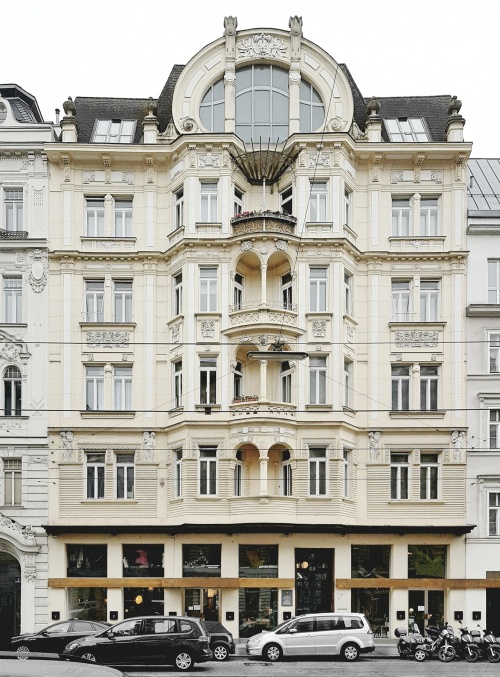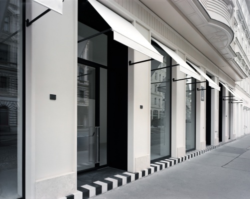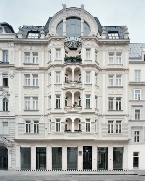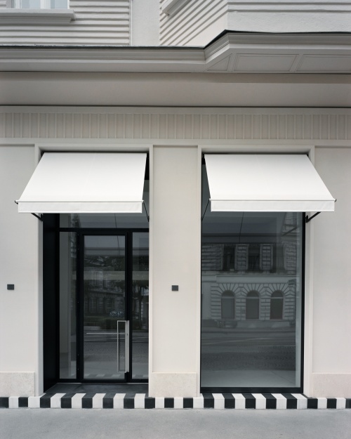 Im sprachlichen Kontext übernehmen die zarten Profilierungen der Putzflächen die reiche Gliederung der Hauptfassade. Markisen setzen ein verbindendes Zeichen der Geschäftslokale zum großzügigen Bürgersteig. Elemente wie Portalgriffe und Haussprechanlage betonen den handwerklichen Charakter der Formgebung. Das Zebra der Stufenkante ist signalgebende Architektur.